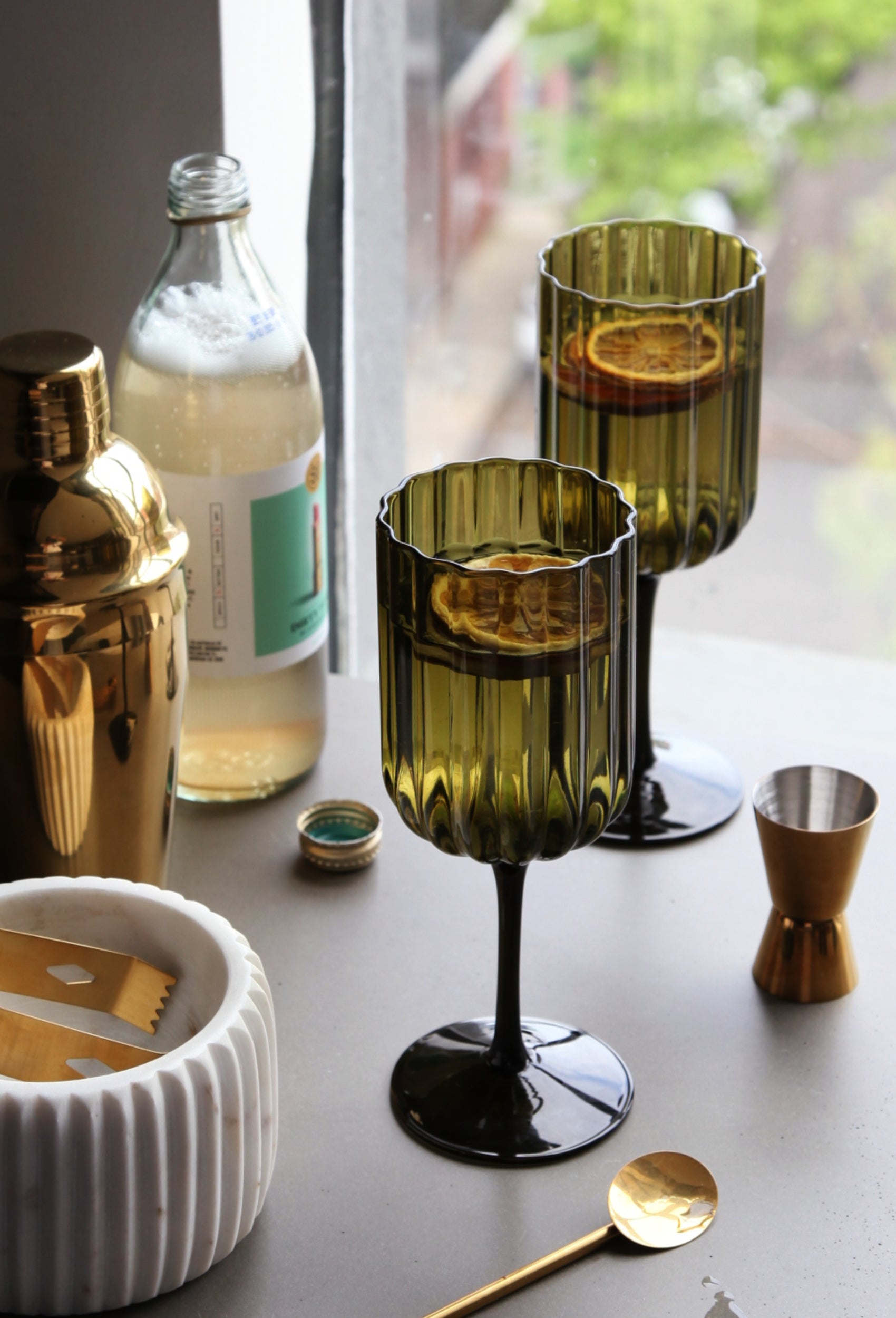 Chic, sculptural and endlessly versatile, this set of fluted wine glasses brings a moody richness to any moment. The olive-toned glass catches the light beautifully, while the scalloped edge adds a refined twist. Style them on a tray with your favourite aperitif, or let them shine on the table for your next dinner at home. Pair with gold-toned accessories or crisp linen for a look that feels both classic and contemporary.