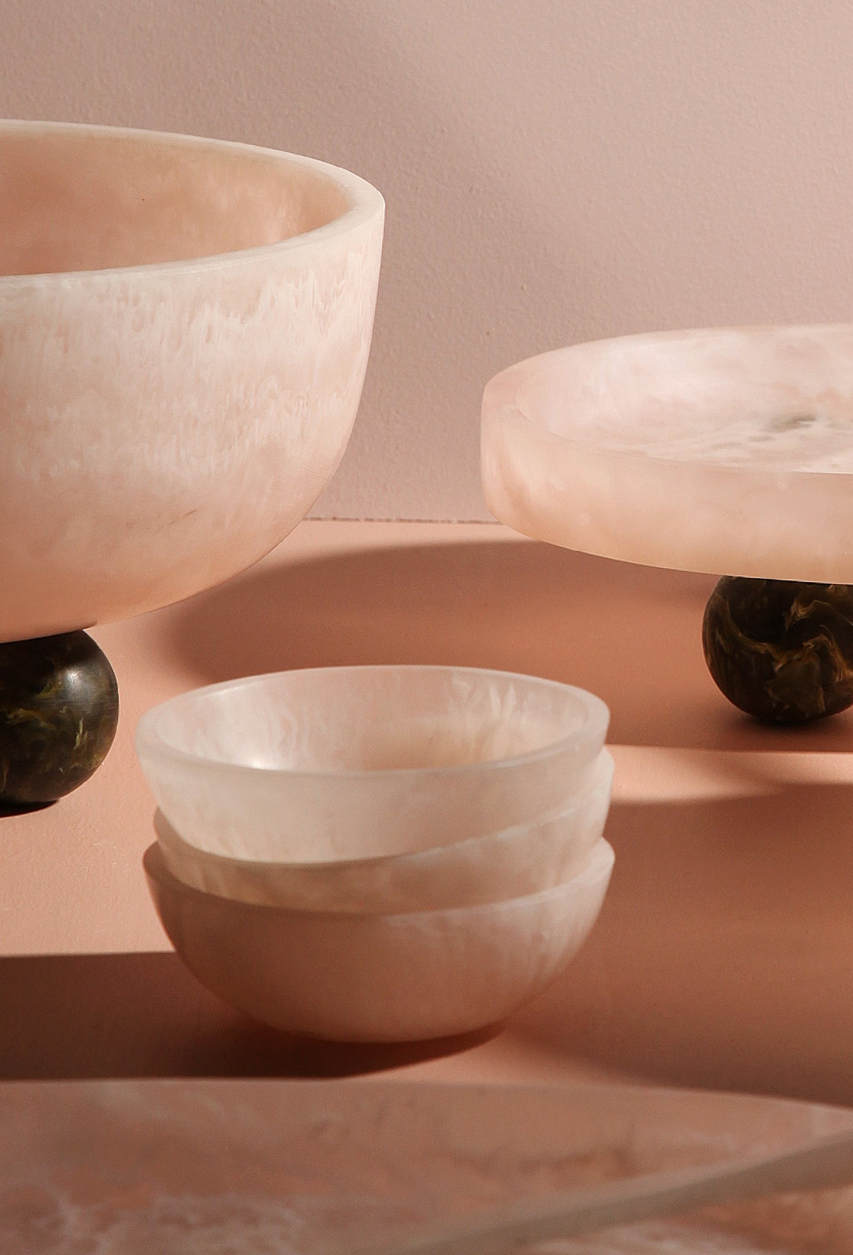 Wooden bowls with scalloped edges hold lemons gathered fresh from the tree. Translucent vases in deep green catch the light. Cabbage leaf ceramics bring playful elegance to the table, while marble trays and resin pieces wait to be filled with moments of gathering.