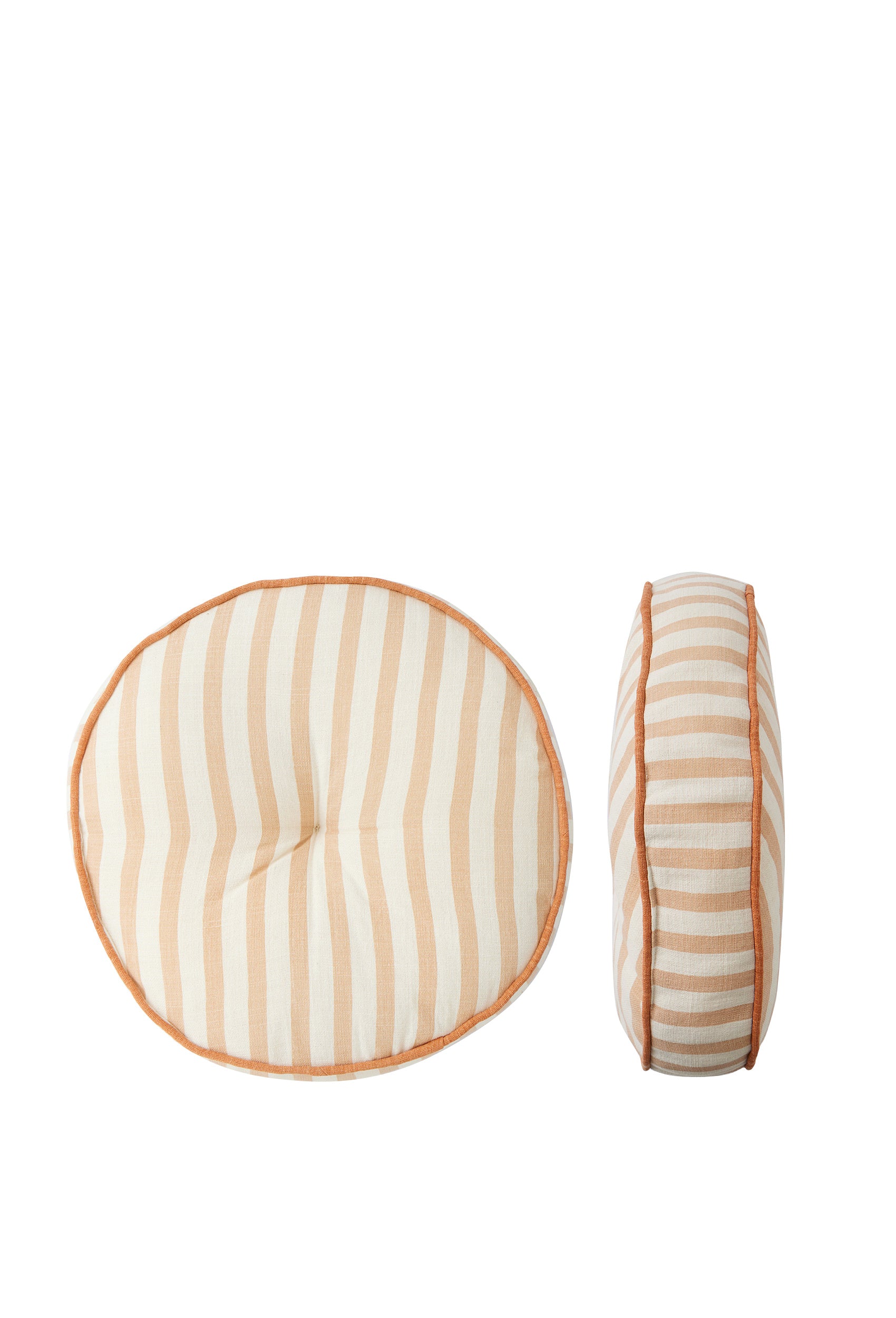 The Sorbetto Round Cotton Cushion in Peach features soft peach and ivory stripes with a buttoned centre and neat piped edge for a gentle, tailored look. Its round profile layers easily with square cushions on a sofa, bed, or armchair, introducing quiet colour and subtle pattern to a considered space.