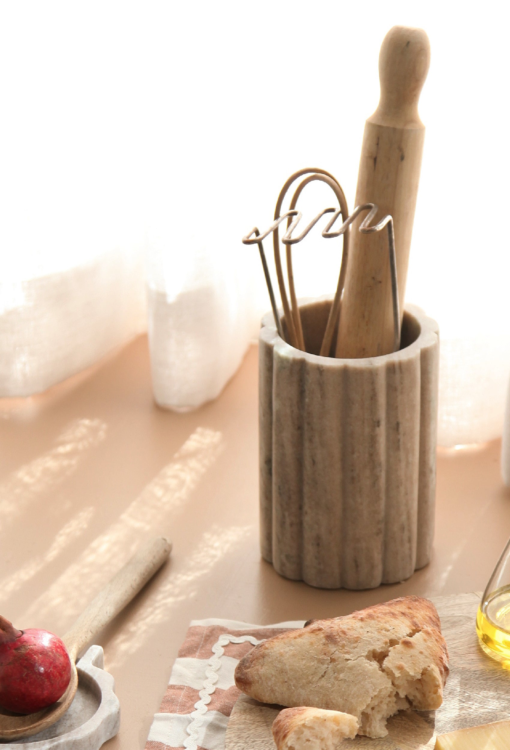 Wooden bowls with scalloped edges hold lemons gathered fresh from the tree. Translucent vases in deep green catch the light. Cabbage leaf ceramics bring playful elegance to the table, while marble trays and resin pieces wait to be filled with moments of gathering.