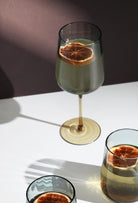 Elegant with a modern mood, the Timmons Wine Glasses feature a striking ombré fade from deep teal blue to amber. Designed for slow sipping and visual impact, their slender stems and rounded bowls give them a timeless yet contemporary feel. Perfect for wine, water, or even a dramatic dessert presentation, these glasses bring refined colour and soft sculptural form to your table. A beautiful match for neutral linens, stoneware, or jewel-toned accents.