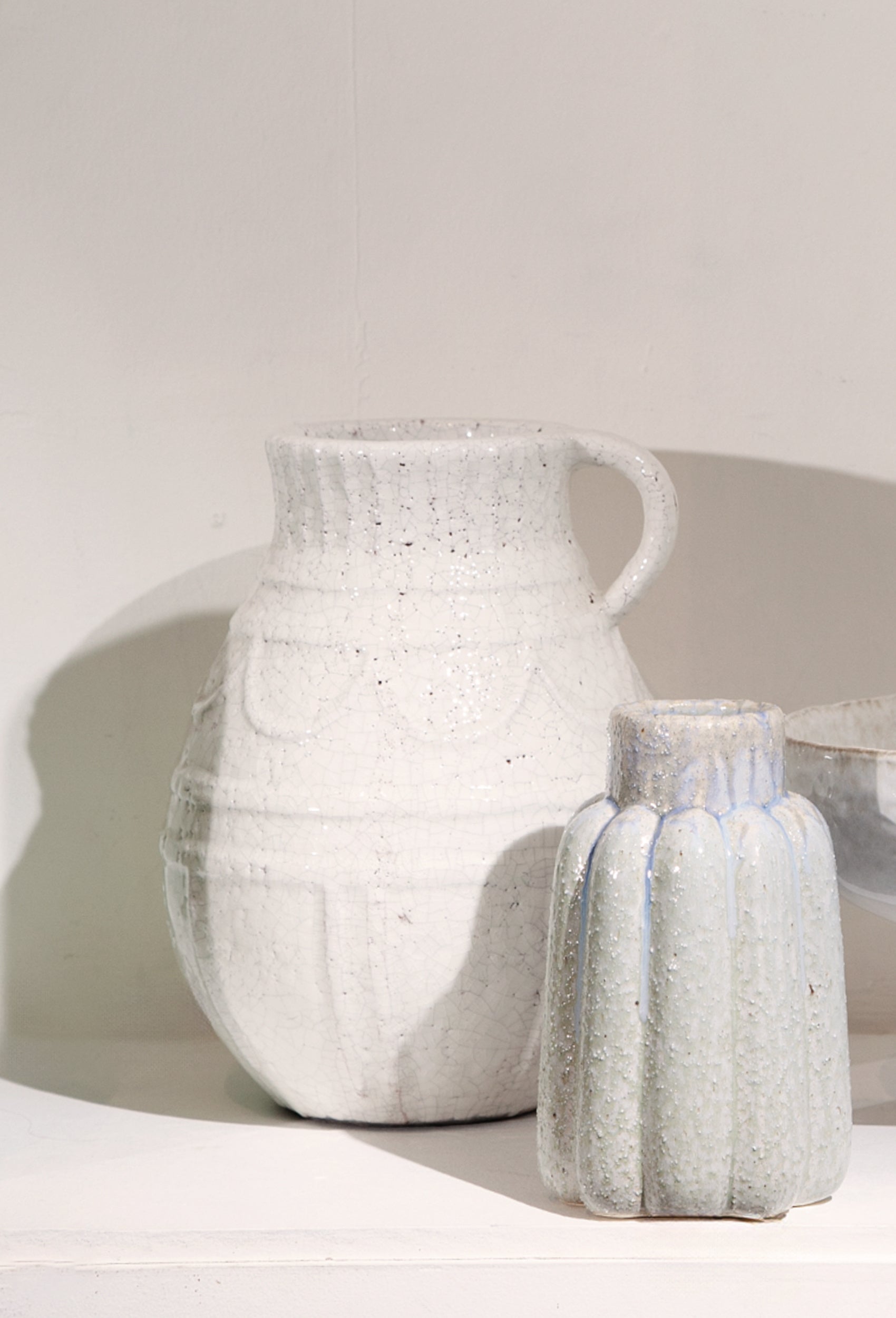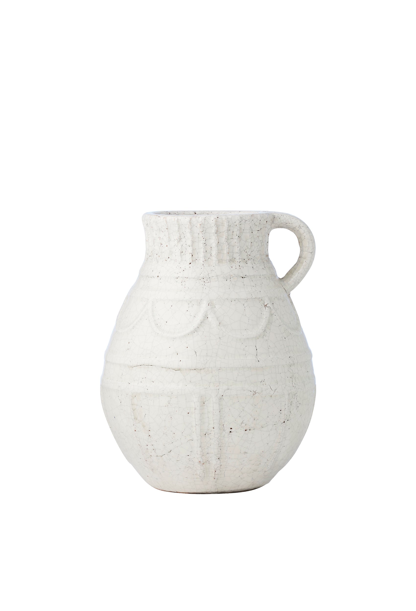 The Clara Ceramic Urn in White is a study in quiet beauty. Crafted with a softly rounded form, a single side handle and subtle embossed detailing, it feels both timeless and sculptural. The white crackle glaze adds depth and texture, giving the piece a gently aged character that makes it easy to layer into any interior.