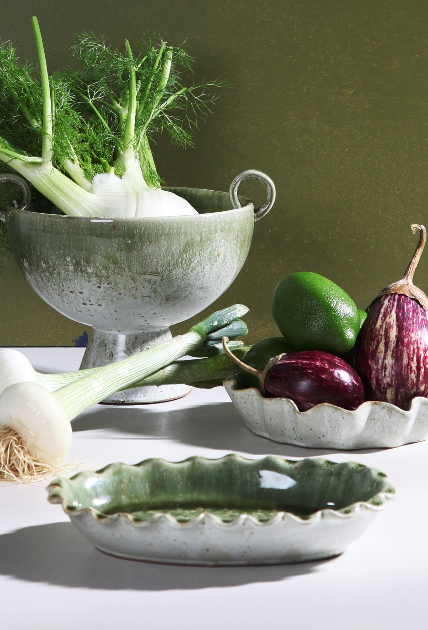 Elena Scalloped Oval Ceramic Dish in Olive