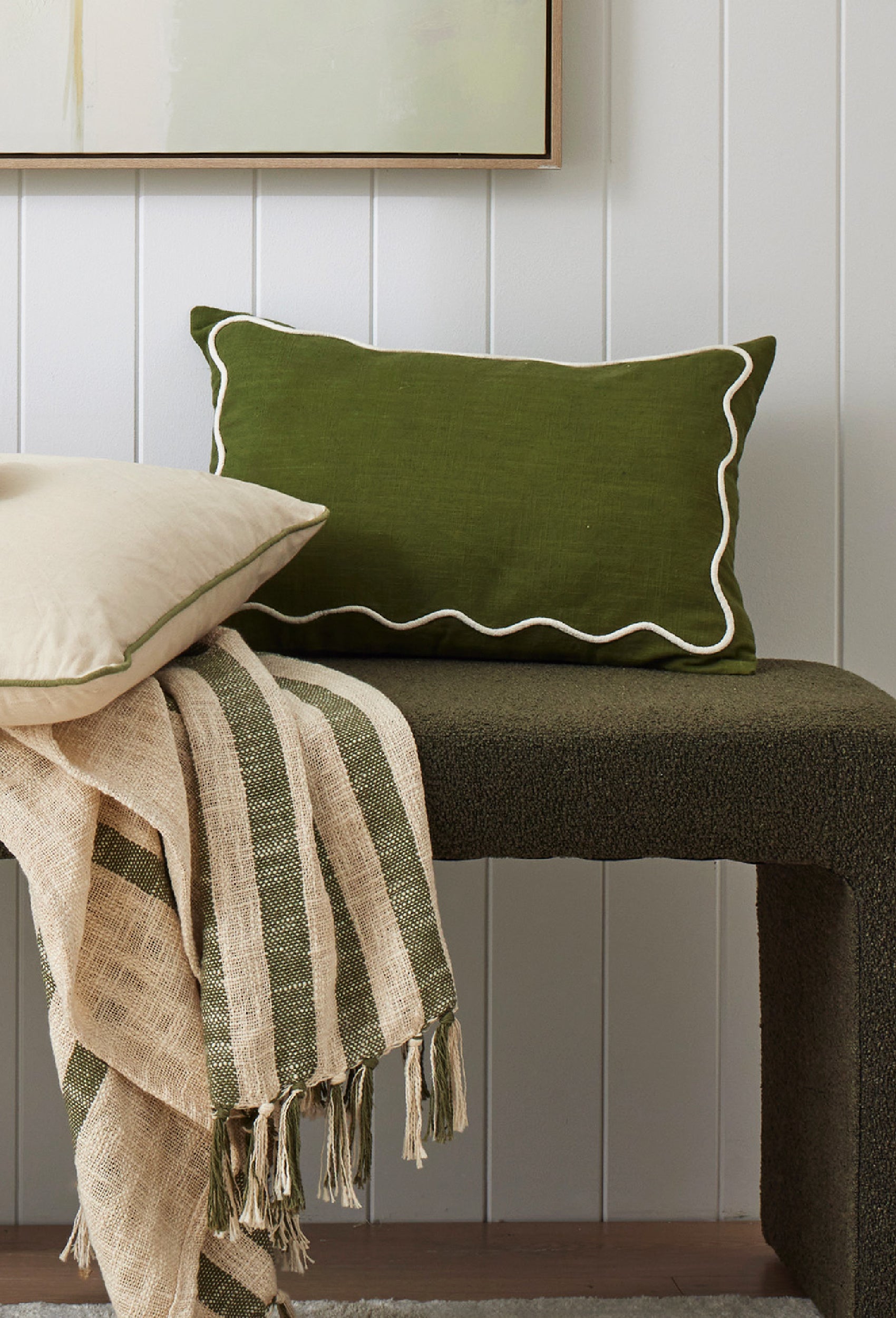 The Palmer cushion in olive is a chic and versatile accessory that adds comfort and style to any living space. Classic rectangular shape with ric-rac trim. Consider styling with other pieces from the collection.